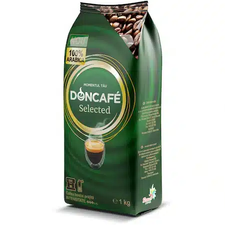 DONCAFE Selected Cafea Boabe are o aroma intensa de cafea rasnita pe loc, iar gustul sau fin iti aduce experienta de cafenea la tine acasa. Astfel te vei bucura de momente savuroase, in comfortul personal.