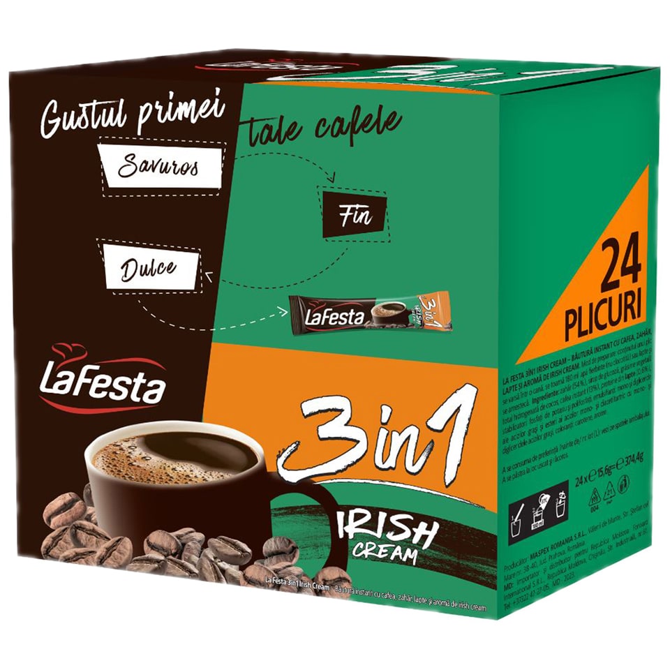 LA FESTA 3in1 Irish Cream 24 x 15.6 g, cafea la plic, instant, tip 3in1, cu gust de irish. Se prepara rapid, adaugand apa firbinte.